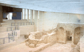Im kleinen Ort San Boi bei Barcelona wurden bei Ausschachtungsarbeiten die am besten erhaltenen Reste eines römischen Bades aus der Zeit des 2. Jh.v.Chr. in Katalonien und eine Produktionsstätte für Amphoren aus der Zeit 30-20 Jahre n.Chr. entdeckt. Diese sollten der Öffentlichkeit zugänglich gemacht werden. Um sie vor der Witterung zu schützen und um gleichzeitig die mehrere Meter unter dem heutigen Niveau liegenden Mauerreste und Mosaiken erreichen zu können, wurde ein im Querschnitt terrassenartiges Museumsgebäude darüber errichtet. Die einzelnen Stufen dienen als Sitzreihen für Besuchergruppen. |