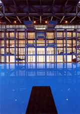 Zwei riesige Stahlseen in einem Apfelbaumhain, so stellen sich die beiden für 550 Millionen Mark errichteten vergrabenen Sportarenen auf den ersten Blick dar. Sie sind trotz ihrer schieren Größe kaum zu sehen, da sie in Mulden versenkt sind und ihre Dächer das Niveau des öffentlichen Parkes nur wenig überragen. Die äußere strenge, geometrische Form ergibt sich durch die innere Nutzung, ein Rechteck für die Schwimmhalle und ein Kreis für das Oval der Radrennbahn. Selbst die Tragkonstruktion des runden Daches ähnelt einer Radfelge mit 48 Speichen. Es spannt, auf 16 Randstützen ruhend und 3500 Tonnen schwer, frei über 115 Meter und wird häufig mit dem Raumschiff aus dem Film Independence Day verglichen. Das Wettkampfbecken hat olympische Dimensionen und durch aufwendige technische Maßnahmen ein sehr schnelles Wasser. Die Sprunganlage mit ihrer kubischen Ausformung erinnert an ein Kunstwerk von Donald Judd. |