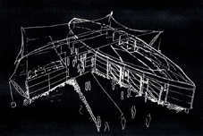 Das Gebäude ist für die zehnmalige Verwendung auf einer alljährlich stattfindende Ausstellung in Wales als leicht auf- und abbaubare modulare Struktur geplant. Das Raumkonzept besteht aus drei getrennten Bereichen, einem großen Ausstellungsbereich, einem überdachten Freibereich und einem Kinogebäude. Das Konstruktionsprinzip des Ausstellungsbereichs besteht aus einer aufgestelzten, durch einen Zuggurt verspannten linsenförmigen Randträgerebene, die durch ein pneumatisches Dach ausgesteift wird. Von diesen Träger werden pivotierend die immer gleich großen, zu öffnenden Wandelemente abgehängt. |