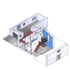 Aus einer Scheune wird ein modernes Wohnhaus. Die Fassaden des als mittleres Gebäude in einer Zeilenbebauung liegenden Hauses mit seinen kleinen Fenstern bleibt weitestgehend erhalten, um das Ortsbild nicht zu stören. Das Innere wird allerdings vollkommen entkernt und tiefer gelegt, um in Teilbereichen ein Obergeschoss zu ermöglichen. Zusätzliches Tageslicht kommt durch Glasflächen im Dach herein und über gebäudehohe Lufträume bis ins Erdgeschoss. Die Verwendung von Glas für die Treppenstufen und einen Verbindungssteg erhöhen die innere Transparenz. Die Räume sind durch Öffnungen in den Wänden visuell miteinander verbunden. |