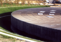Zwei riesige Stahlseen in einem Apfelbaumhain, so stellen sich die beiden für 550 Millionen Mark errichteten vergrabenen Sportarenen auf den ersten Blick dar. Sie sind trotz ihrer schieren Größe kaum zu sehen, da sie in Mulden versenkt sind und ihre Dächer das Niveau des öffentlichen Parkes nur wenig überragen. Die äußere strenge, geometrische Form ergibt sich durch die innere Nutzung, ein Rechteck für die Schwimmhalle und ein Kreis für das Oval der Radrennbahn. Selbst die Tragkonstruktion des runden Daches ähnelt einer Radfelge mit 48 Speichen. Es spannt, auf 16 Randstützen ruhend und 3500 Tonnen schwer, frei über 115 Meter und wird häufig mit dem Raumschiff aus dem Film Independence Day verglichen. Das Wettkampfbecken hat olympische Dimensionen und durch aufwendige technische Maßnahmen ein sehr schnelles Wasser. Die Sprunganlage mit ihrer kubischen Ausformung erinnert an ein Kunstwerk von Donald Judd. |