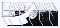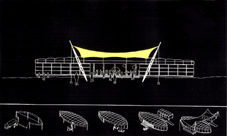 Das Gebäude ist für die zehnmalige Verwendung auf einer alljährlich stattfindende Ausstellung in Wales als leicht auf- und abbaubare modulare Struktur geplant. Das Raumkonzept besteht aus drei getrennten Bereichen, einem großen Ausstellungsbereich, einem überdachten Freibereich und einem Kinogebäude. Das Konstruktionsprinzip des Ausstellungsbereichs besteht aus einer aufgestelzten, durch einen Zuggurt verspannten linsenförmigen Randträgerebene, die durch ein pneumatisches Dach ausgesteift wird. Von diesen Träger werden pivotierend die immer gleich großen, zu öffnenden Wandelemente abgehängt. |