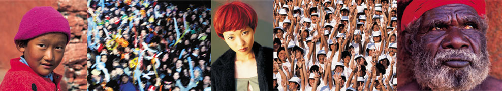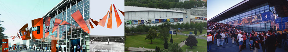 Our second proposal, maybe less ambitious, but feasible in the remaining time slot was an 1.0 kilometer meter long and 5.0 meters high ribbon of X-large images. They literally bound the different halls together. The huge stripe of digital print pictures, which functioned like an oversized film, gave first suggestions about the exhibitions without taking the experience away. The six entrances were marked by artistically shaped portals made from transparent steel mesh boxes. They were filled with randomly chosen objects from each exposition of the Thematic Area. Animated areas for the average waiting periods of one hour completed the kew management. |
