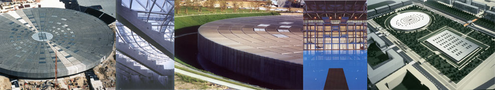 that is how the two sport arenas present themselves at first sight. They can hardly be seen despite their enormous size as they are sunk in the ground and their roofs tower only slightly above the level of the public park. The exterior shape, abstract and geometrical, is purely a result of the internal use. A rectangle for the swimming pool and a circle for the velodrome. |