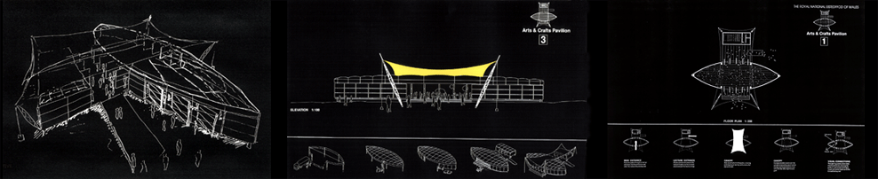 DESCRIPTION: Competion entry for a temporary exhibition building on one of Europe's largest and oldest cultural festivals. It is designed as a modular structure, easy to assemble, dismantle and transport, for ten consecutive re-erections. The spacial concept is composed of three separate areas, a large exhibition area, a covered outdoor area and a screening hall. The basic design principle of the exhibition area consists of a raised lenticular edge beam,
